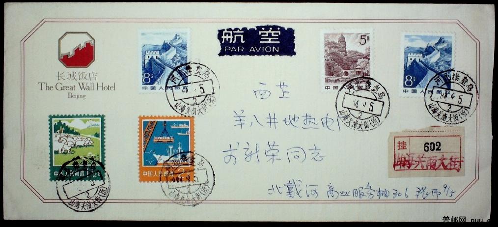 长城饭店公函封加贴长城票84年山海关挂号寄西藏实寄封一枚