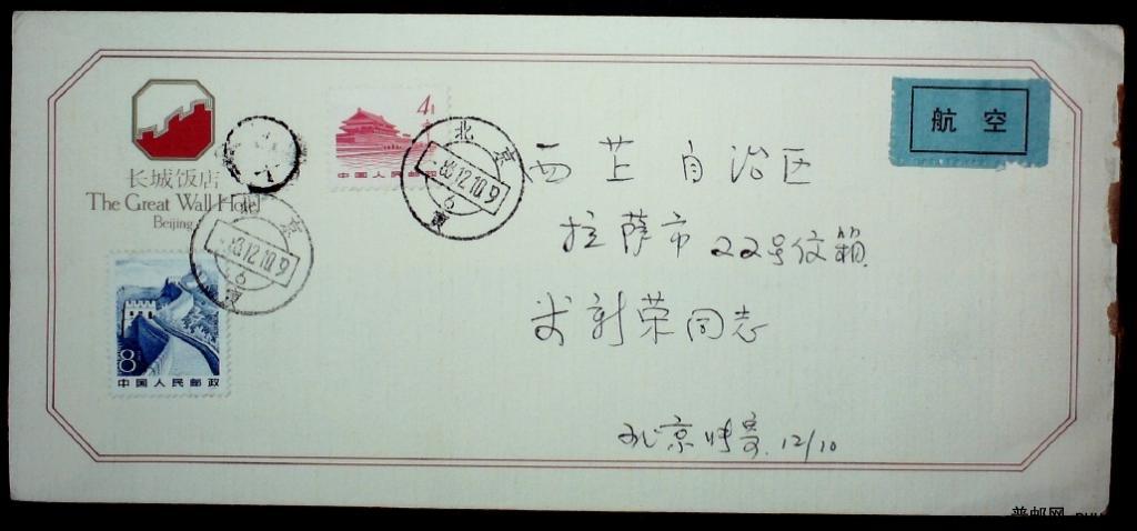 长城饭店公函封加贴长城销北京早期“黄帽子”邮筒特殊“寅”字戳航空寄西藏实寄封一枚