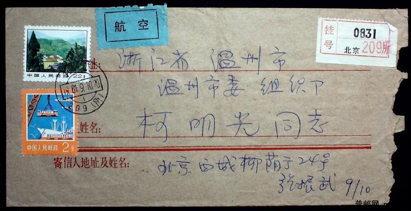 贴普14 22分票1981年北京寄浙江航空挂号实寄封一枚
