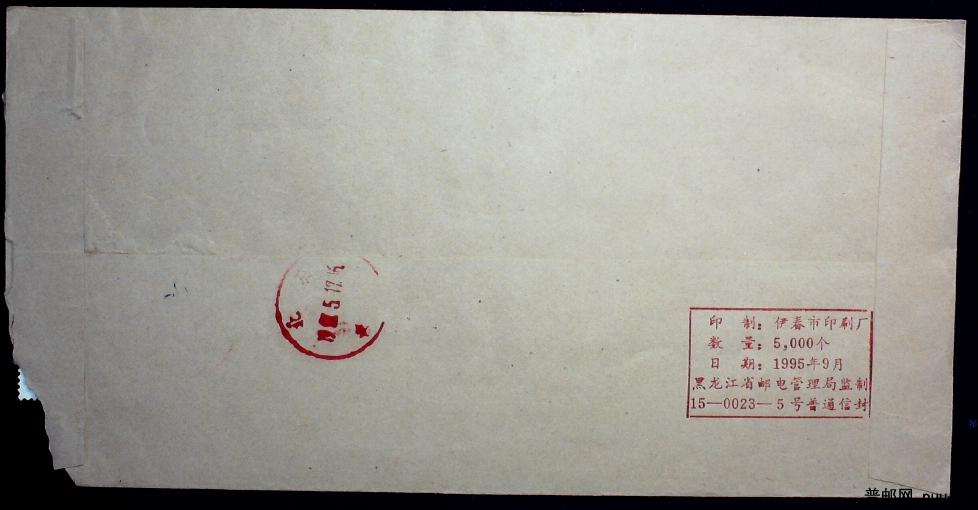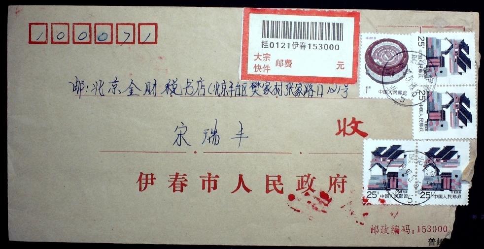 1997年贴民居25分多枚伊春大宗快件实寄封一枚(大宗快件贴票)