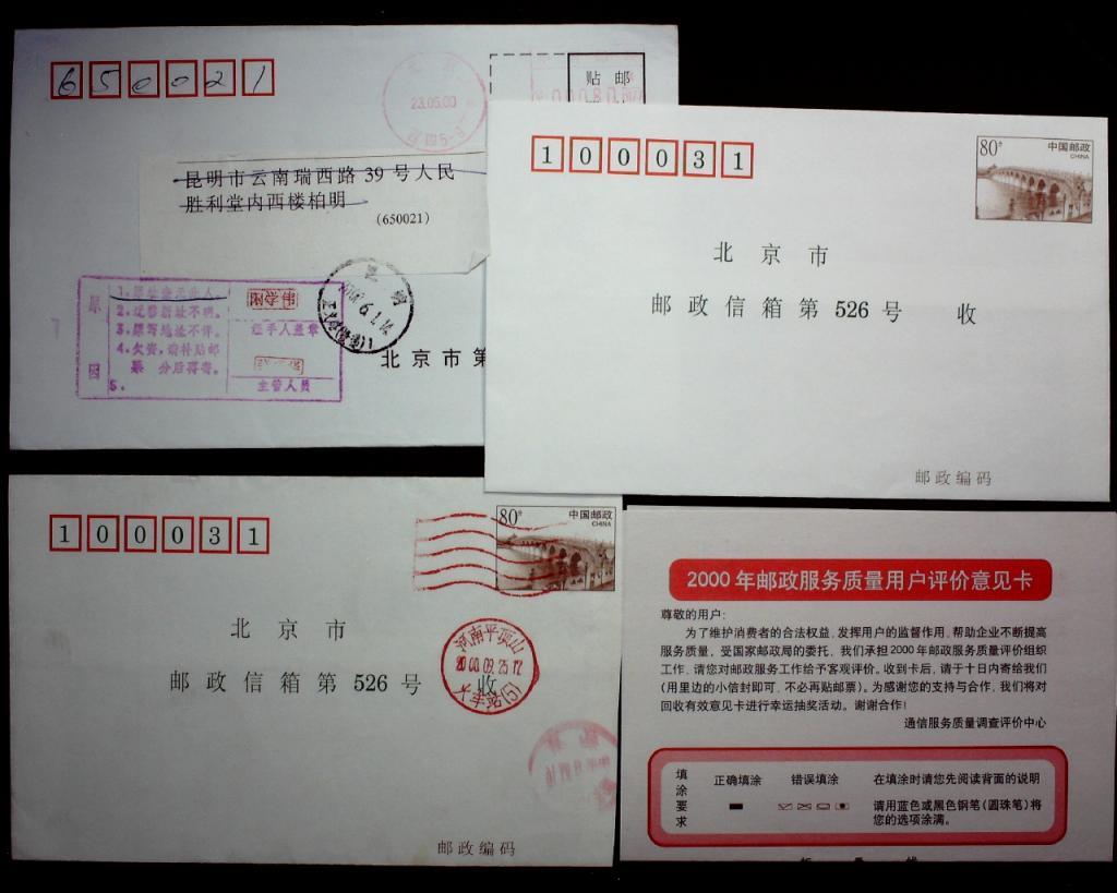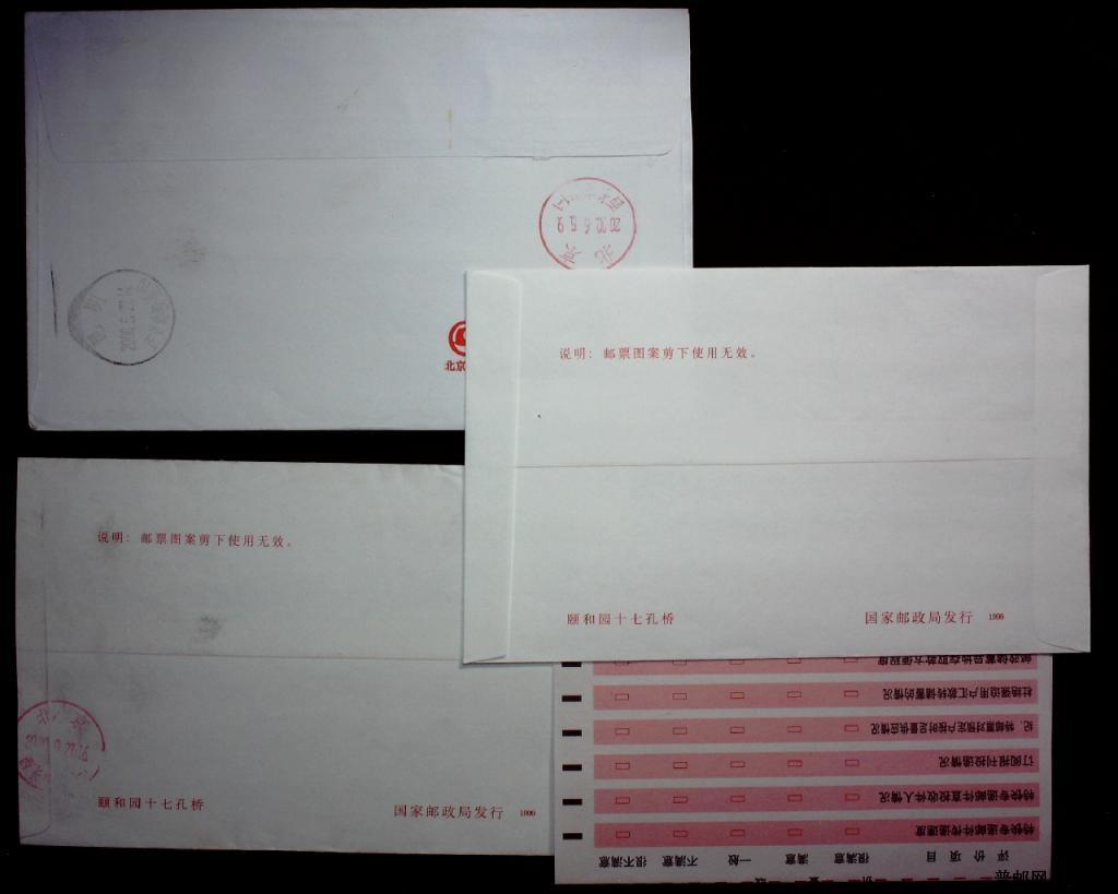 十七孔桥526原封改退一件、新一件、实寄封一件、邮政问卷一件【文字黄绿色】