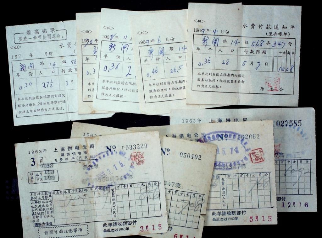 60-70年代上海水电交付单据9枚