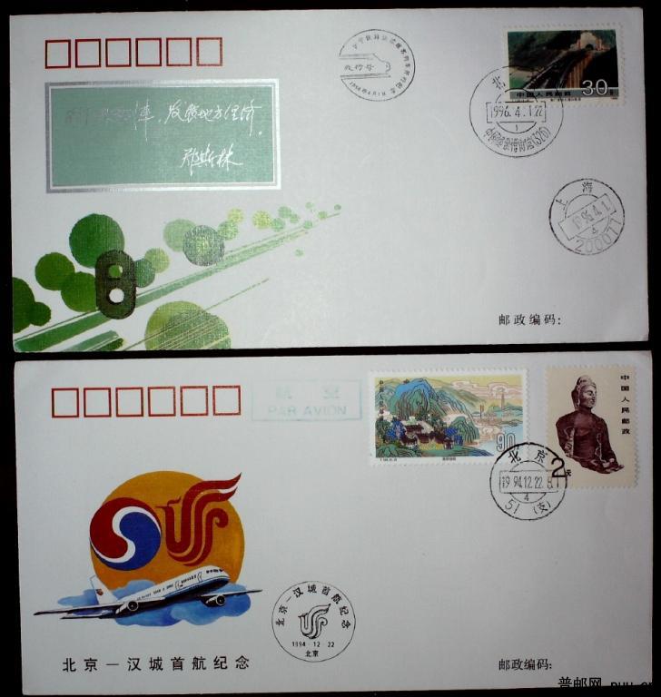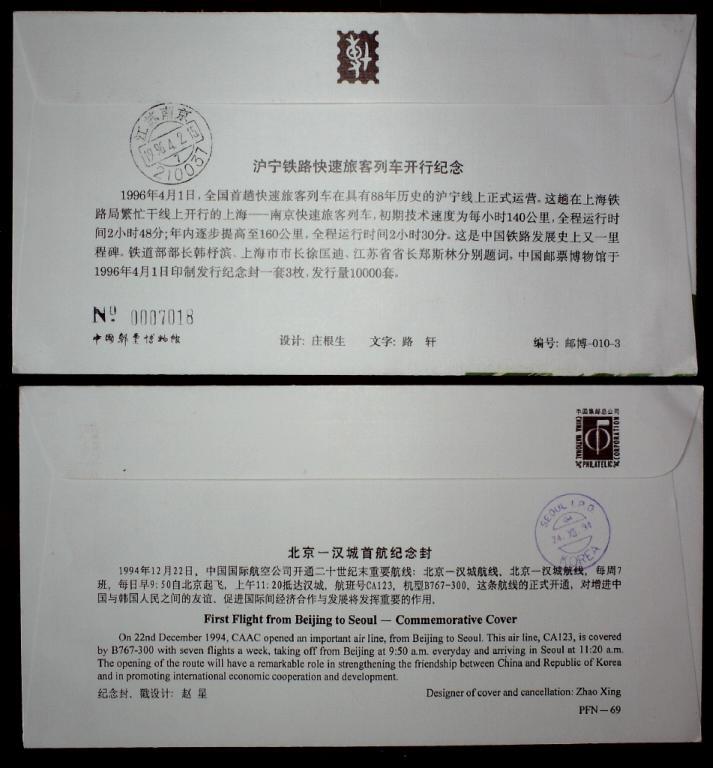 沪宁铁路快速旅客列车开行纪念封、北京汉城首航纪念封各一枚