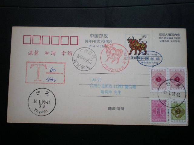 97年牛改值片实寄台湾贴欠资票实寄片