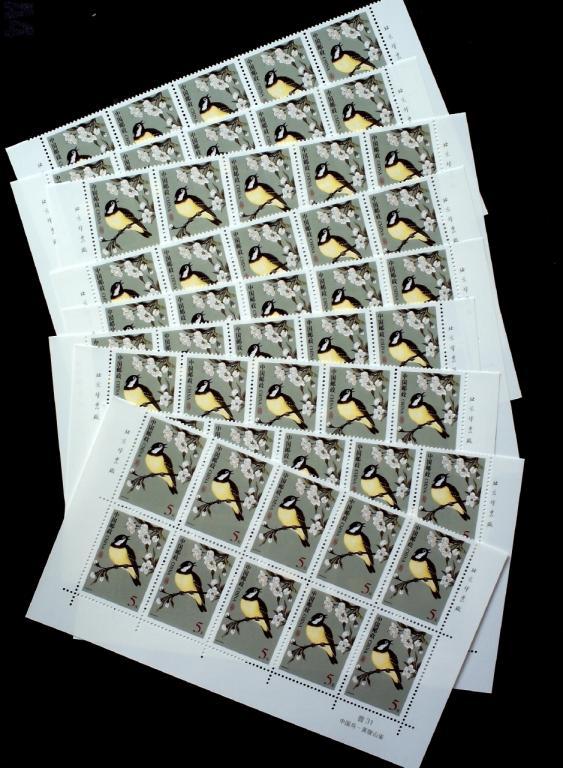 普31 中国鸟5元黄腹山雀下边带厂铭票名10方连9件(面值450元)