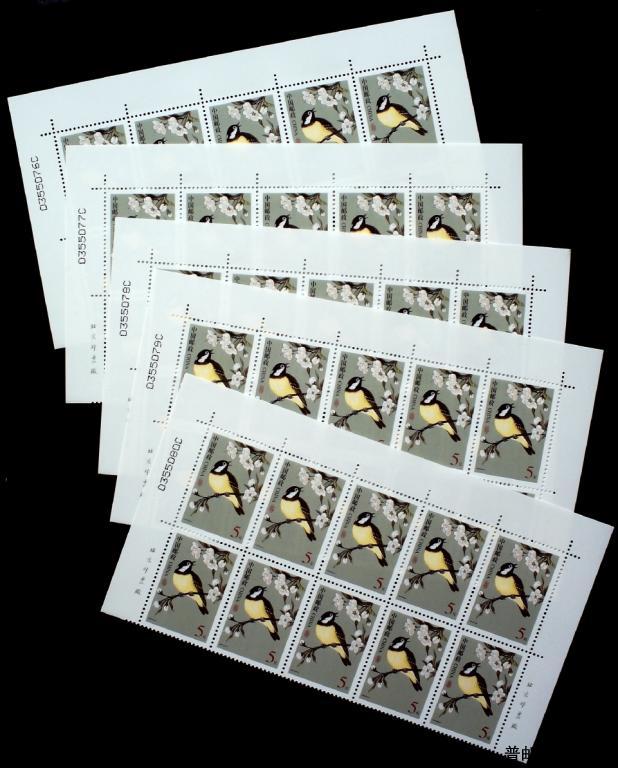 普31 中国鸟5元黄腹山雀上边带厂铭票名10方连5件(面值250元)