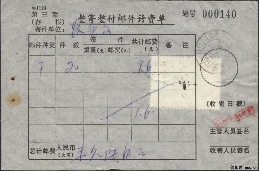 J165(4-4)单贴符资的整寄整付邮件计费单