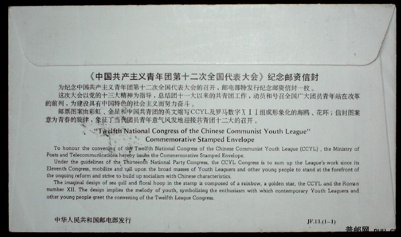 JF13 中国共产主义青年团第十二次全国代表大会纪念邮资封首日实寄封一枚