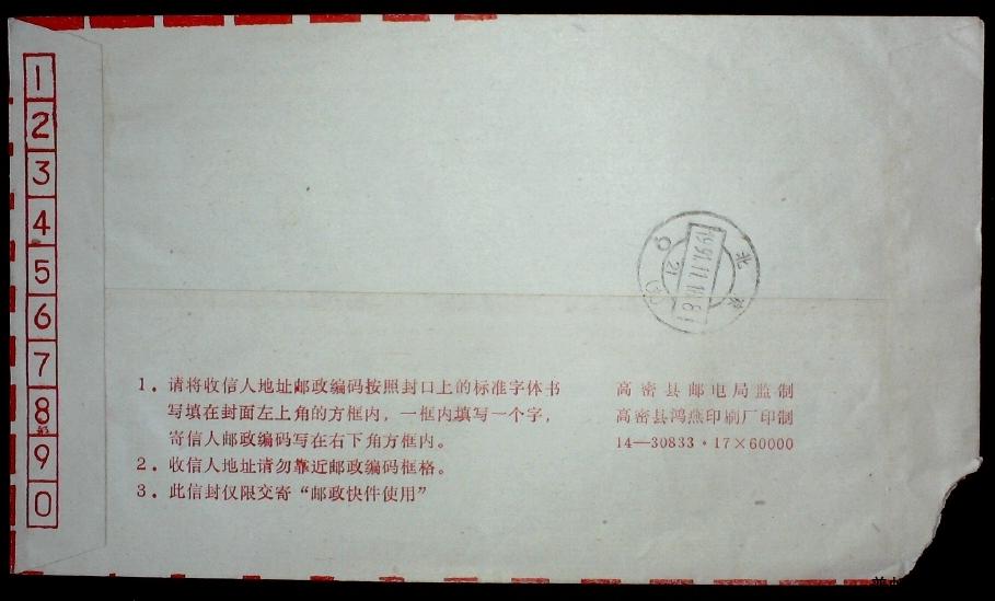 1991年贴民居80分齿孔右移位票山东高密快件戳寄北京实寄封一枚