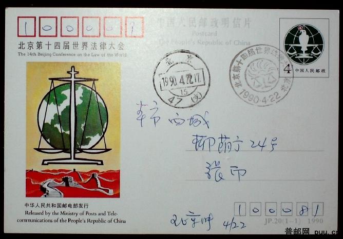 JP20 北京第十四届世界法律大会首日实寄片一枚