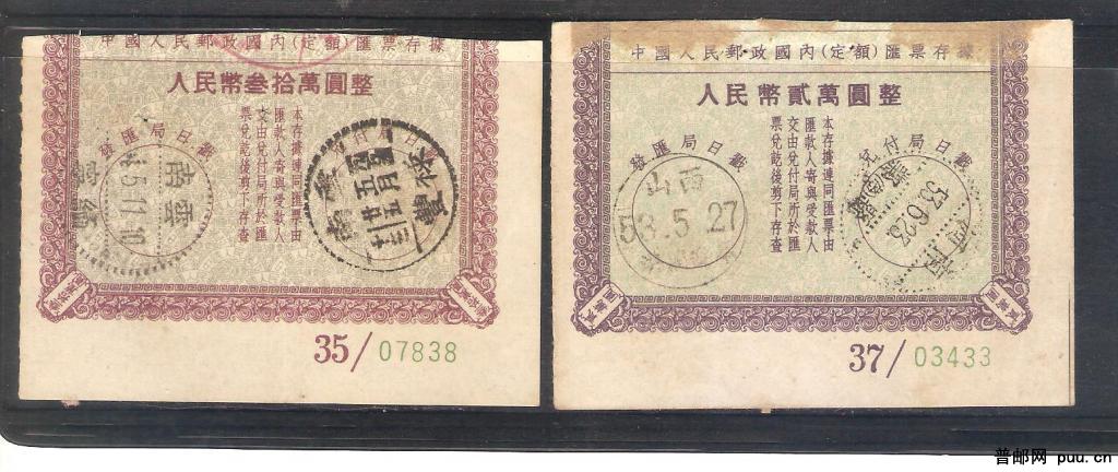 中国人民邮政定额汇票存据两种不同