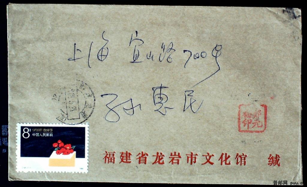 1987年贴J131教师节邮票福建龙岩寄上海实寄封一枚
