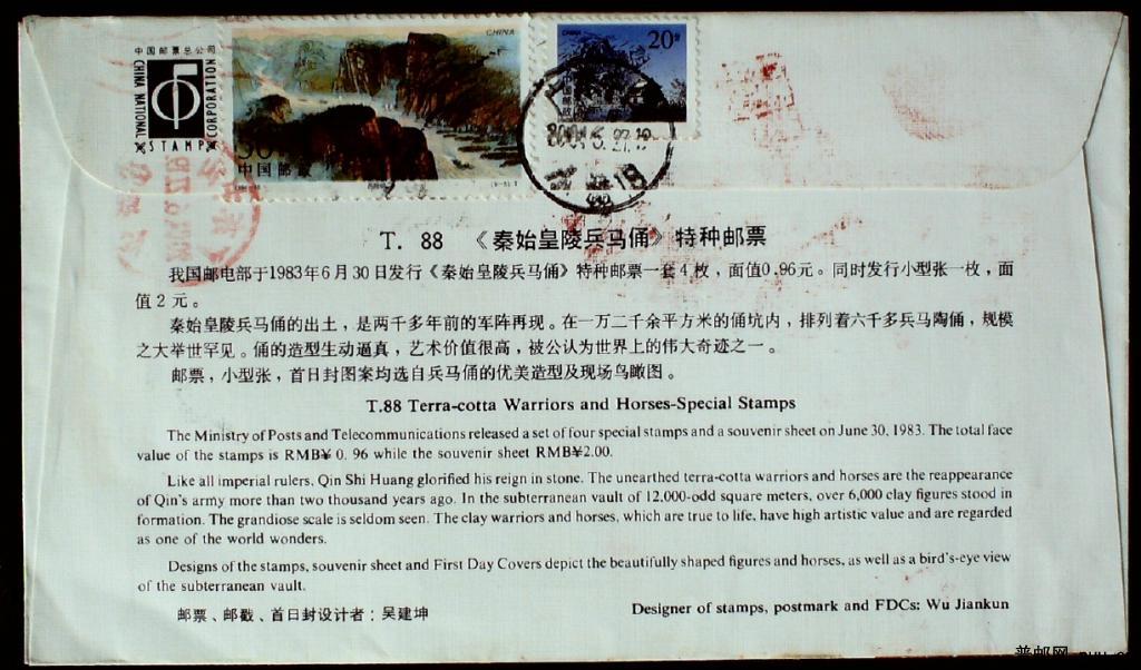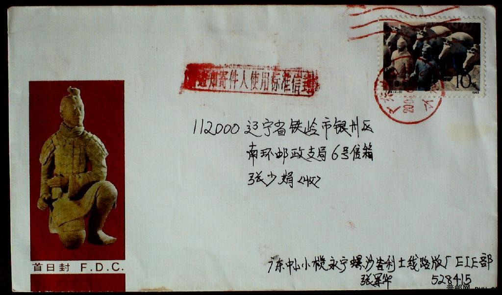 T88兵马俑首日封加贴偏年票及长城20分广州寄辽宁