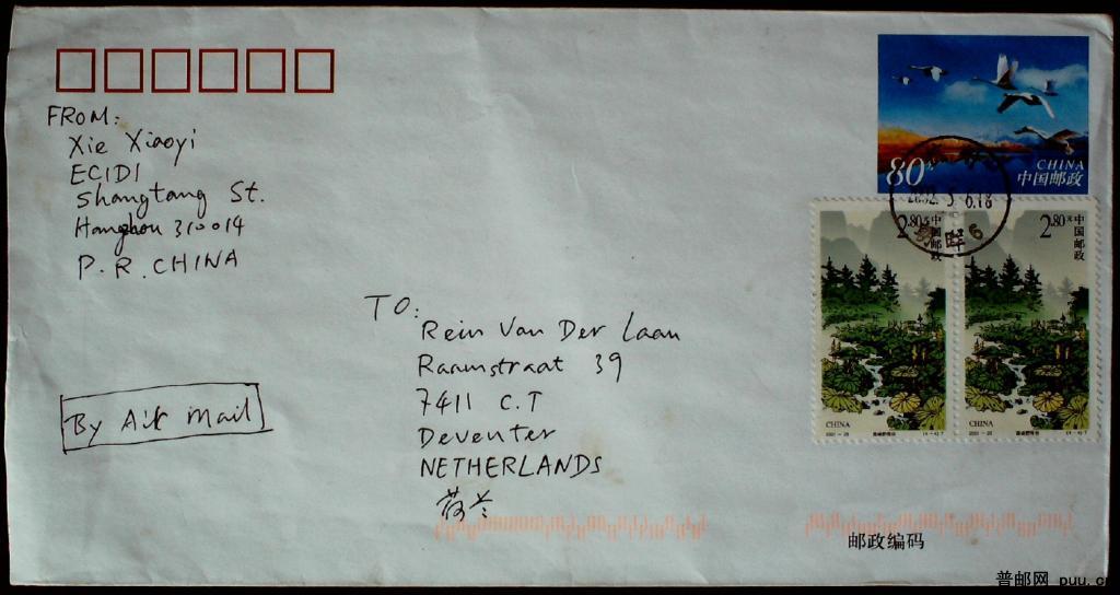 2002年小天鹅普资白封加贴编年票2002年航空寄荷兰实寄封一枚