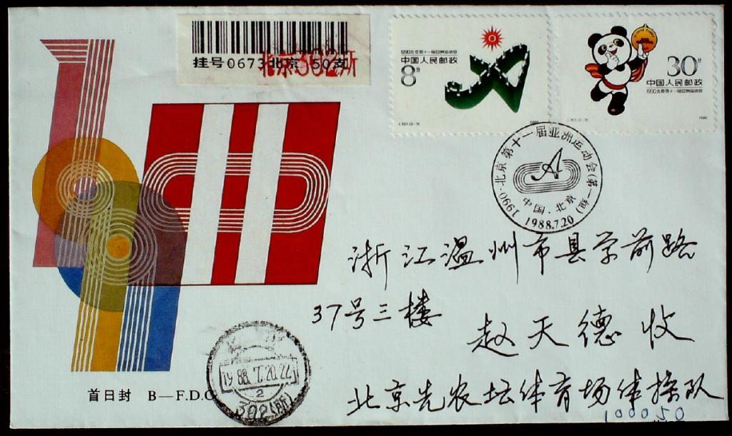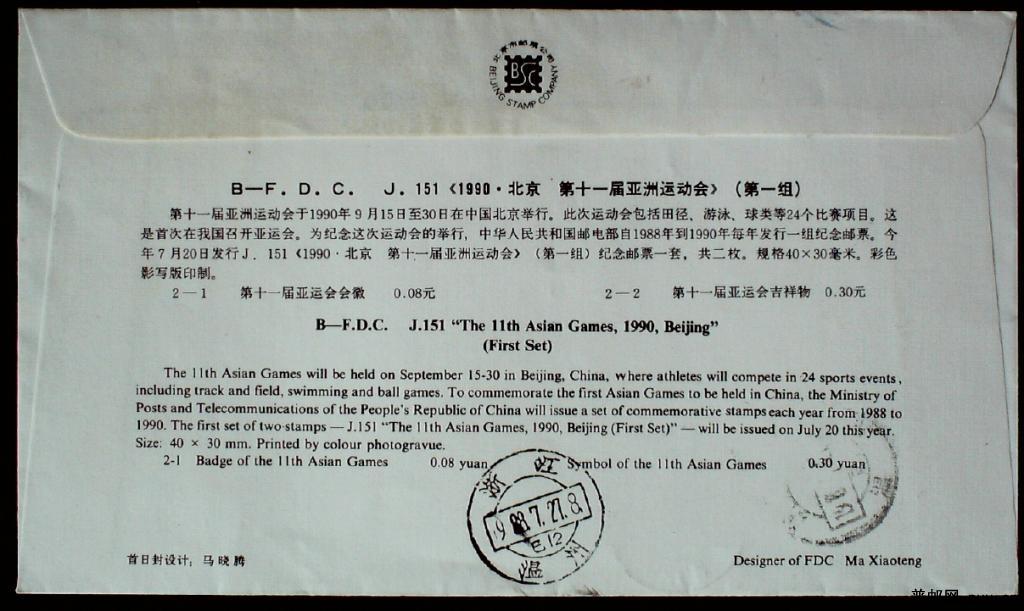 J151 1990年亚运会第一组会徽吉祥物北京公司首日实寄封一枚