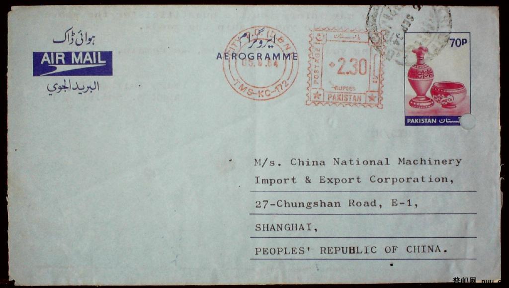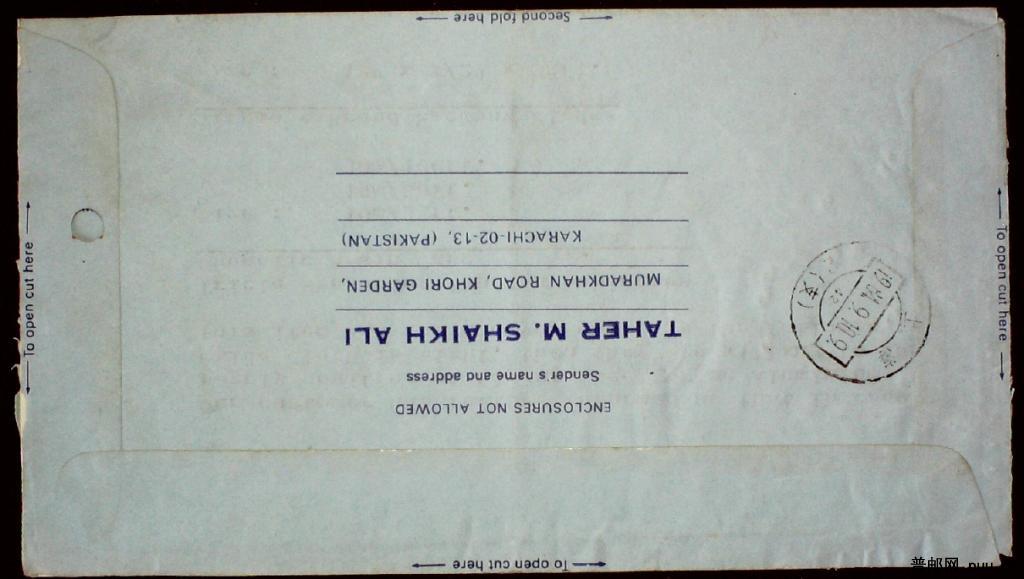 80年代巴基斯坦邮资机戳寄上海实寄封一枚