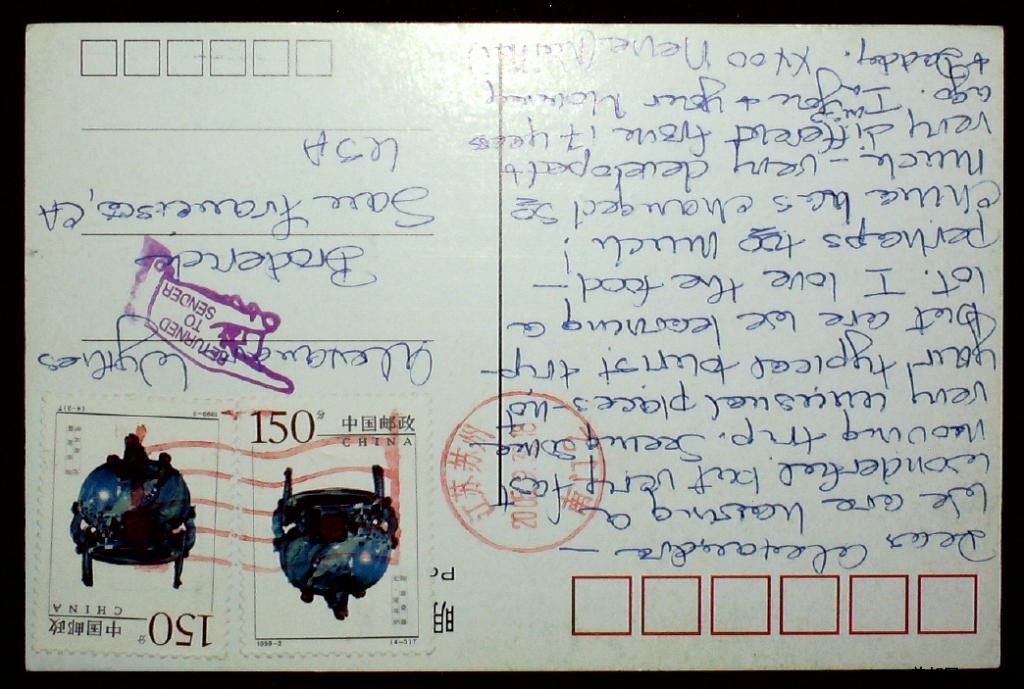 2005年贴编年票150分两枚国际普通明信片实寄片一枚(手型退回戳)