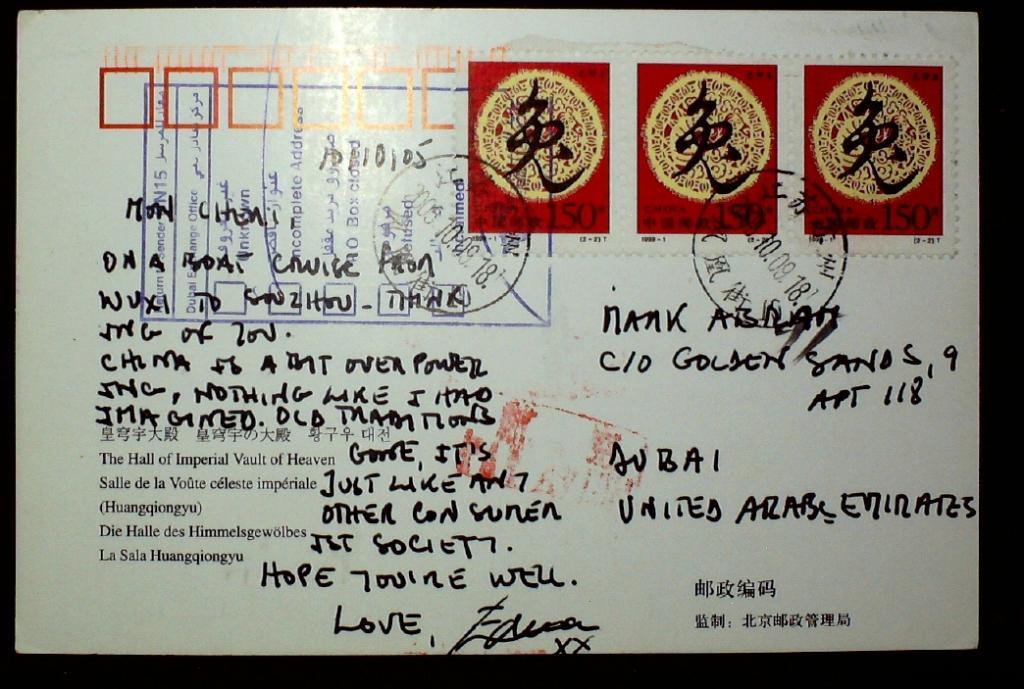 2005年贴兔年生肖票1.5元高值三枚国际航空明信片实寄片一枚(退回)