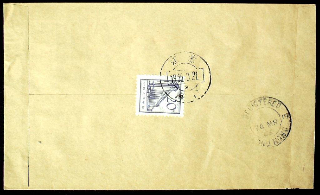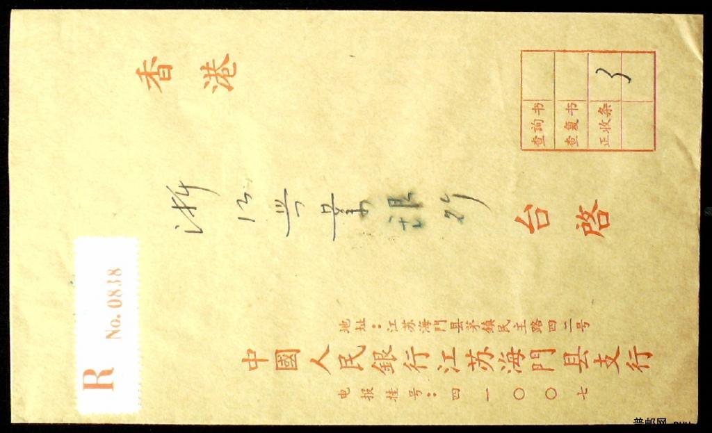 1966年贴普13 20分票江苏海门寄香港银行业务封实寄封一枚
