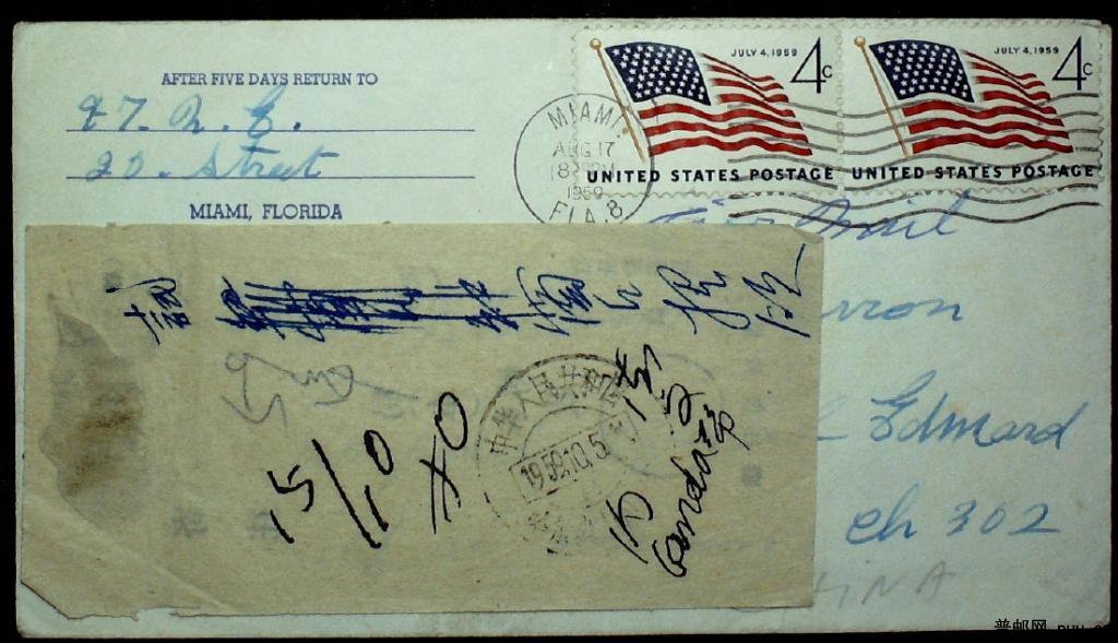 1959年美国寄哈尔滨进口封,有哈尔滨59中英文海关戳试投签条实寄封一枚