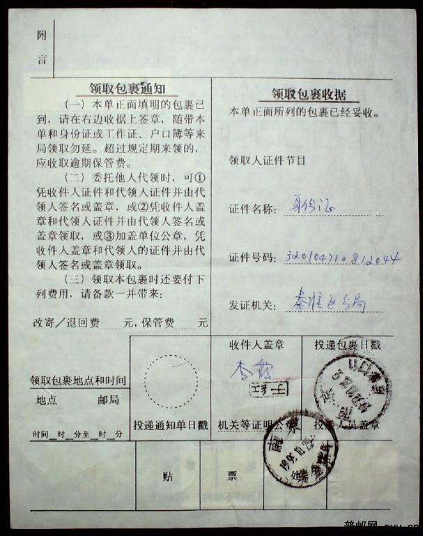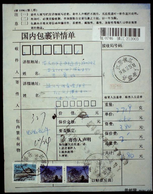 1999年江苏镇江寄南京包单一枚贴长城540分及20分票