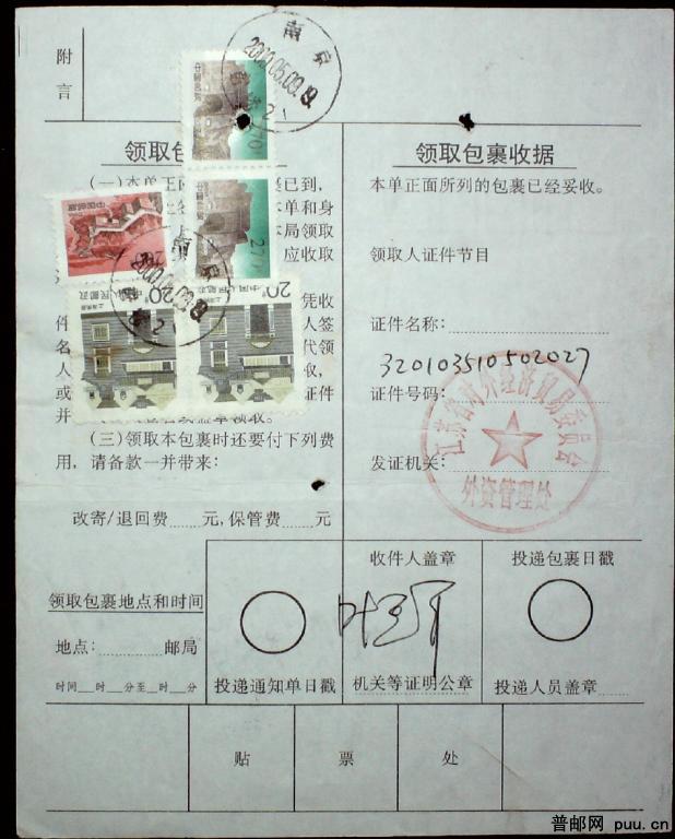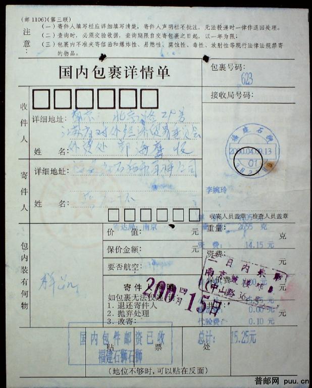 2000年福建石狮寄南京包单一枚贴长城270分两枚及其他