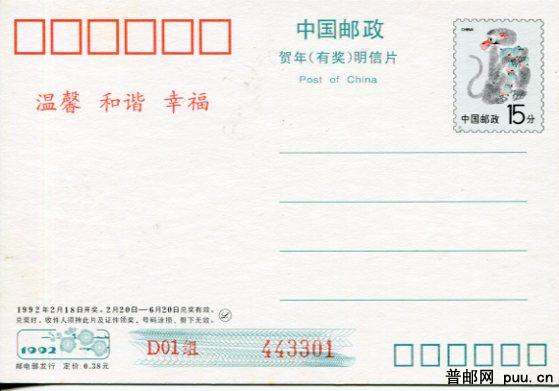 贺年有奖片 1992年猴 全白片D01 V10 新12全