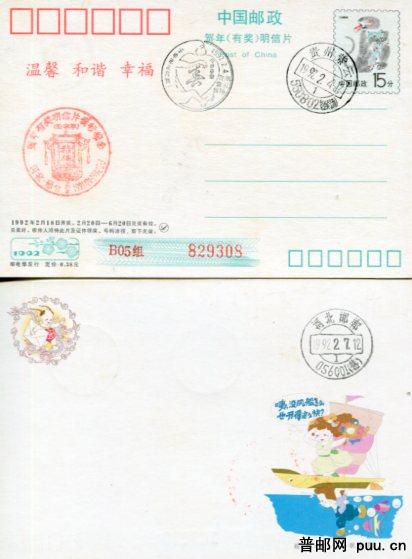 贺年有奖片 1992年猴 盖贵州紫云-羊场日戳和除夕纪念戳