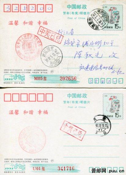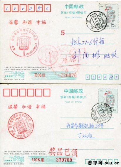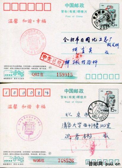 贺年有奖片 1992年猴 盖各地兑奖戳不同戳式旧10枚