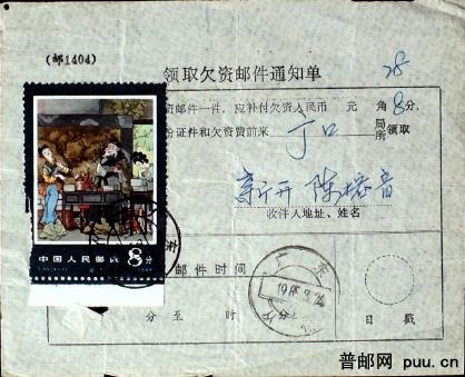 1985年贴T94牡丹园8分票欠资邮件通知单一件