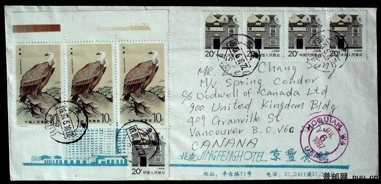 1987年贴T114秃鹫10分及居民20分等票北京寄美国实寄封一枚