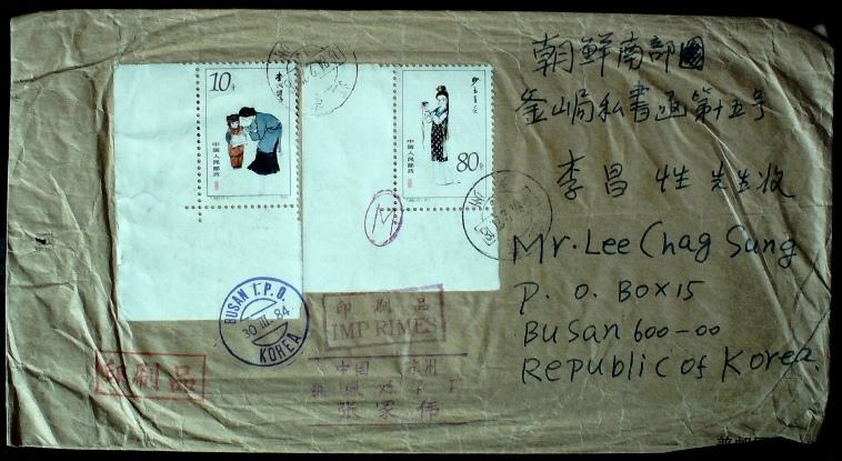 1984年贴T69红楼梦10分 80分票各一枚国际印刷品苏州寄韩国实寄封一枚