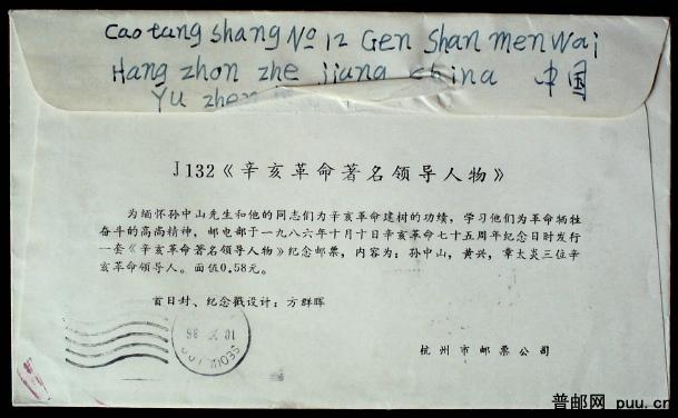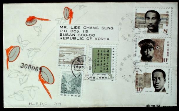 1986年J132辛亥革命人物杭州首日封加贴邮票寄韩国实寄封一枚