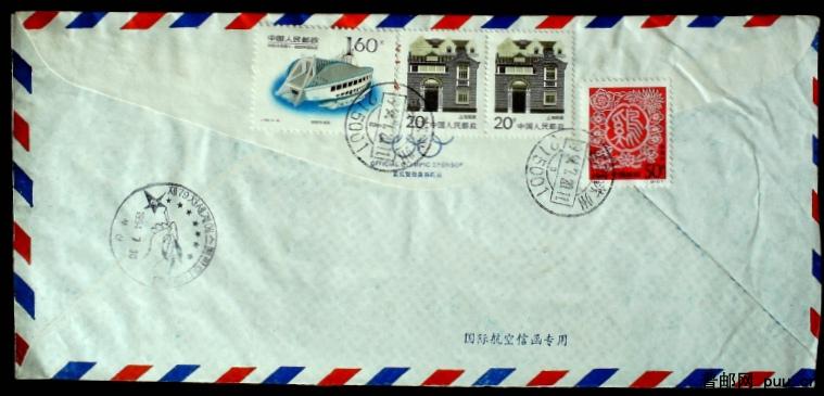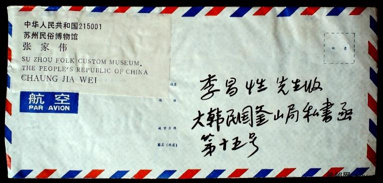1994年贴鸡年生肖票及亚运会场馆等苏州寄韩国实寄封一枚