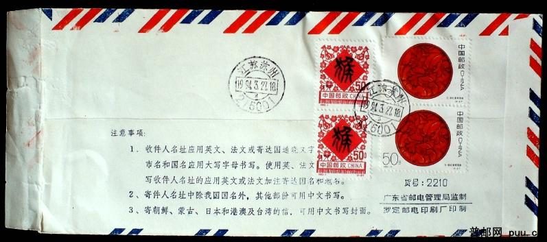 1994年贴猴年生肖票等苏州寄韩国实寄封一枚