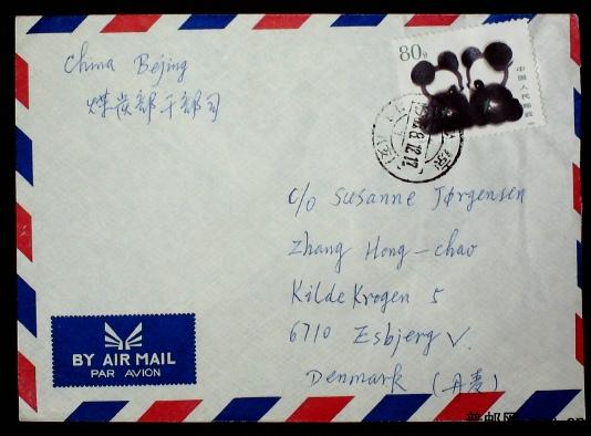 1985年贴T106熊猫80分北京寄丹麦实寄封一枚