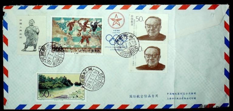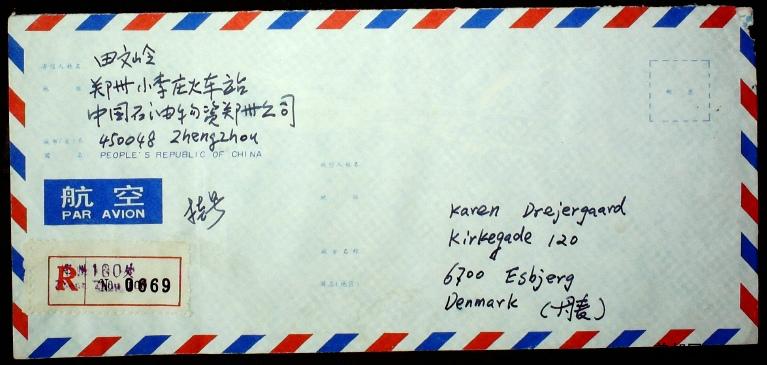 1995年贴编年高值票等邮票河南郑州寄丹麦国际航空挂号实寄封一枚