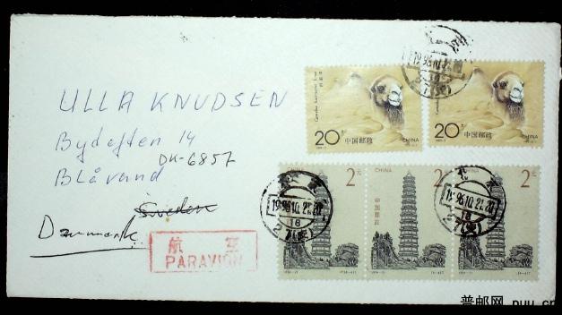 1994年贴高值编年票北京寄丹麦航空实际封一枚