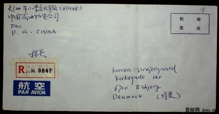 1995年贴编年票及其他普票郑州航空挂号寄丹麦实寄封一枚