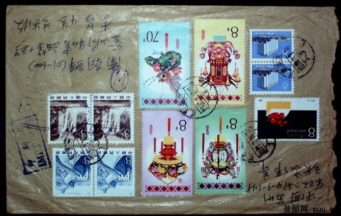 1987年贴T104宫灯全套及其他票江苏苏州国际平刷寄韩国实寄封一枚