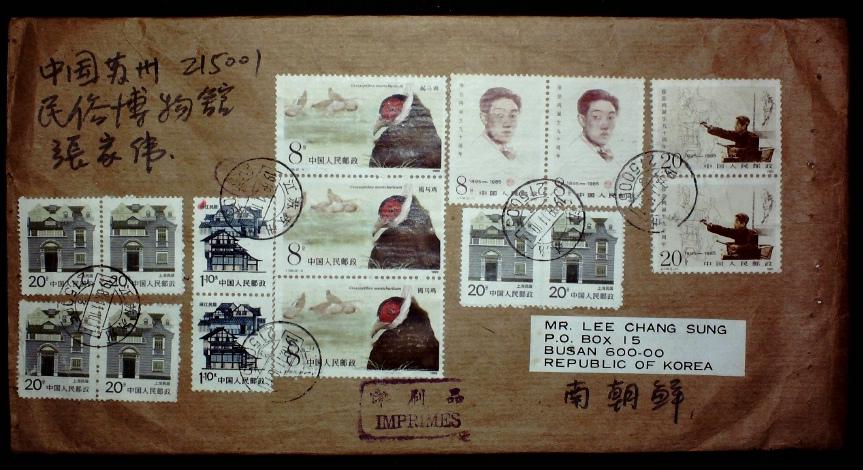 1989年贴J114徐悲鸿等JT票及居民110分等邮票江苏苏州国际平刷寄韩国实寄封一枚