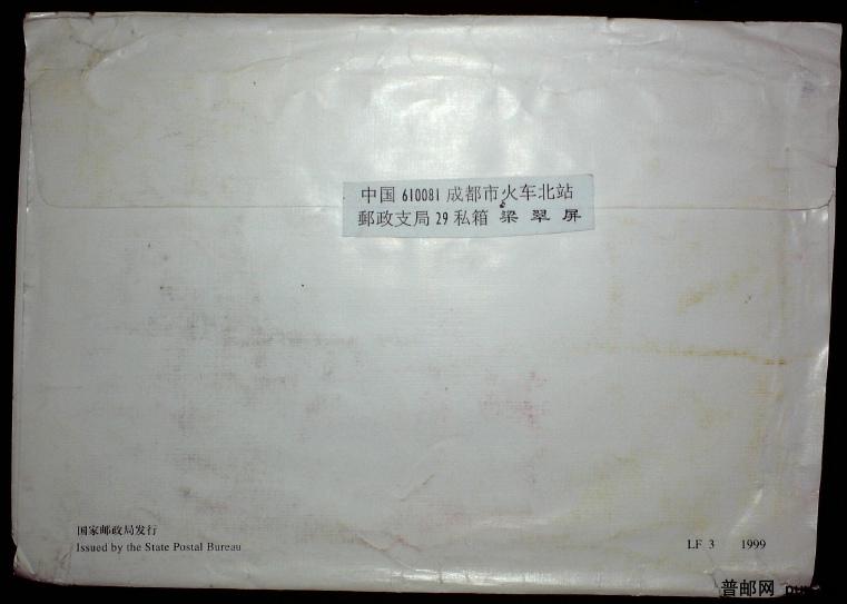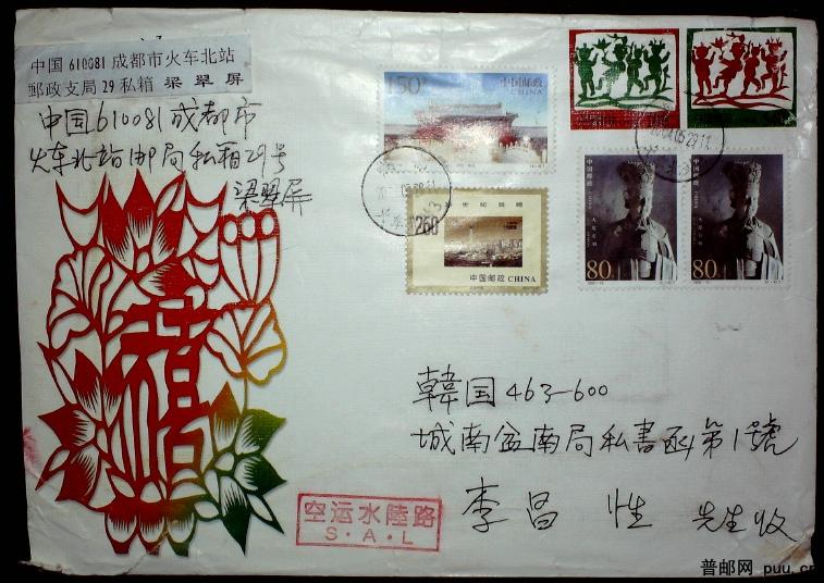 2004年LF3普治封加贴编年票四川成都空运水陆路寄韩国实寄封一枚