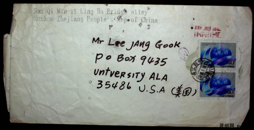 1990年贴J163建国四十周年票江苏湖州国际平刷寄美国实寄封一枚