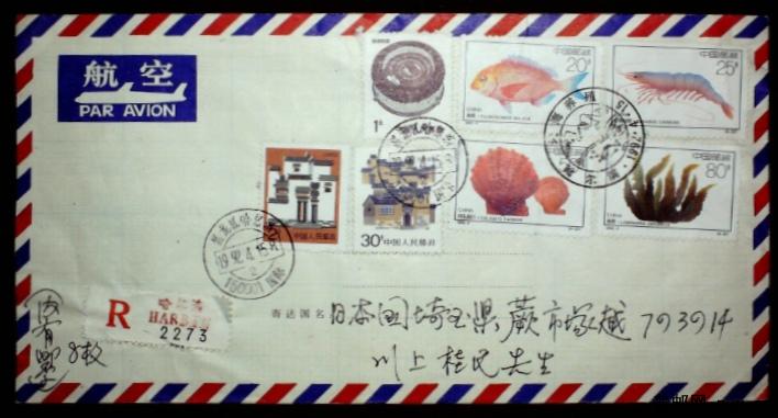 1992年贴1992-4近海养殖全套票哈尔滨首日航空挂号寄日本实寄封一枚