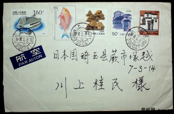 1992年贴亚运场馆高值及其他普票等上海航空寄日本实寄封一枚