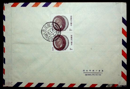 1992年贴居民1元双联浙江绍兴寄日本航空平信实寄封一枚
