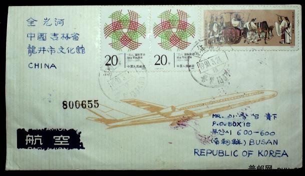 1990年贴J162孔子1.6元高值票吉林龙井寄韩国国际航空平信一枚