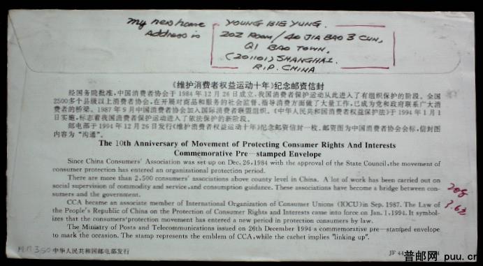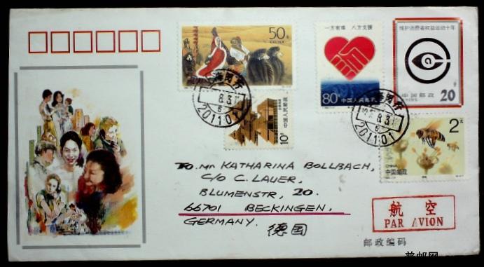 90年代JF44加贴编年票及普票上海寄德国国际航空实际封一件