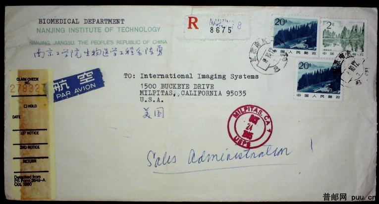 1985年贴普21 2元普22 20分江苏南京航空挂号寄美国实寄封一枚