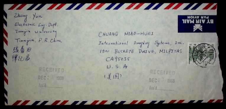 1988年单贴普21 2元票天津寄美国航空实寄封一枚